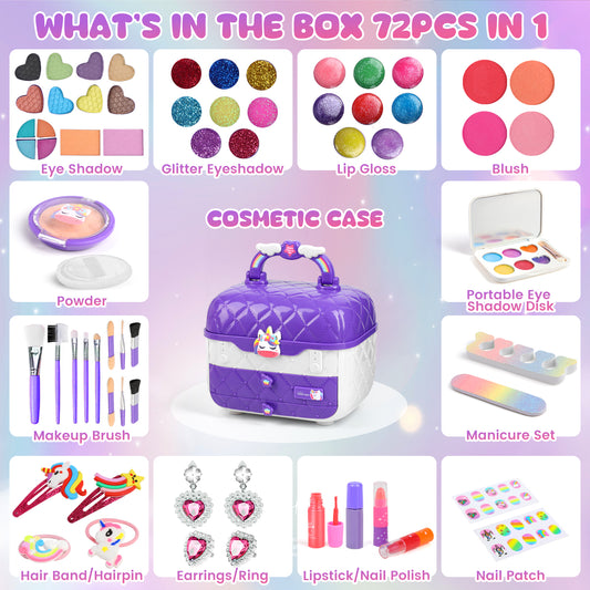 72 PCS Kids Makeup Kit for Girl Toys, Real Washable Makeup Set for Little Girls, Princess Toys Birthday Gift for 3-12 Year Old Girls