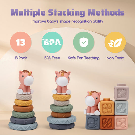 13PCS Soft Blocks for Babies 6 12 18 Months, Unicorn Baby Bath Toys, Montessori Teething Toys, First Birthday Gifts for Baby Girls Boys.