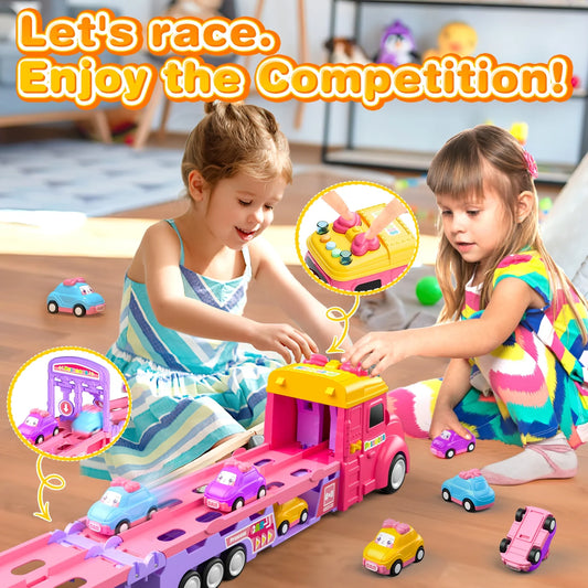 9 in 1 Princess Toy Carrier Truck for Girls, Foldable Transport Truck, Toddlers Pull Back Girl Toy Car Set for 2 3 Years Old, Kids Birthday Gift Christmas Toys Gift for Girls 3 4 5 6+