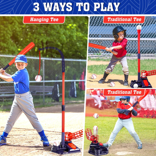 3-in-1 Kids Baseball Set for Ages 3-8, T-Ball Sport Play Set Toys, Baseball Bat Adjustable Height, Indoor/Outdoor Backyard Sports Games Gifts for Boys and Girls(Blue)