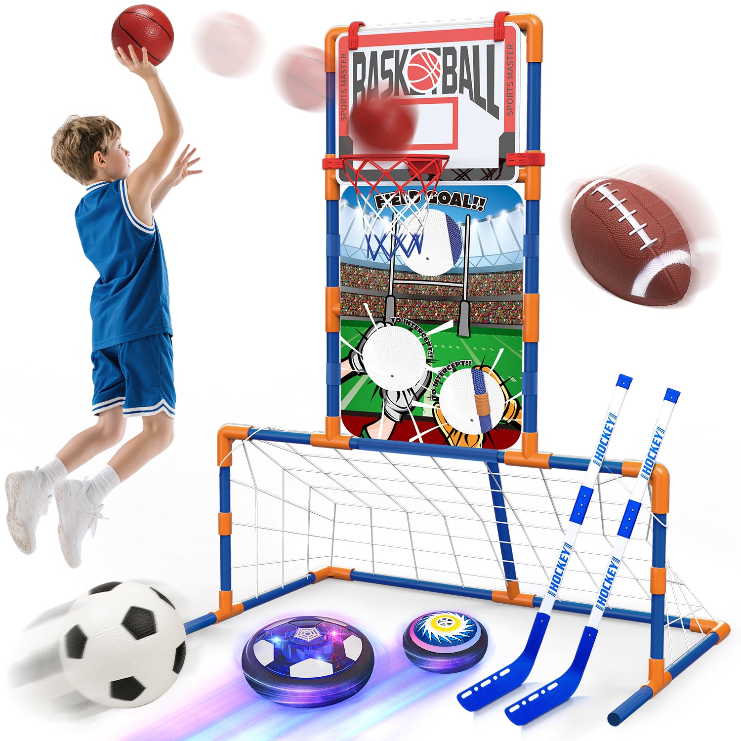 5 in 1 Kids Basketball Hoop, Toddler Basketball Goal, Soccer Goal, Hover Ball, Bean Bag Toss and Hockey, Sport Indoor Outdoor Game Toys for Boys 3-8+
