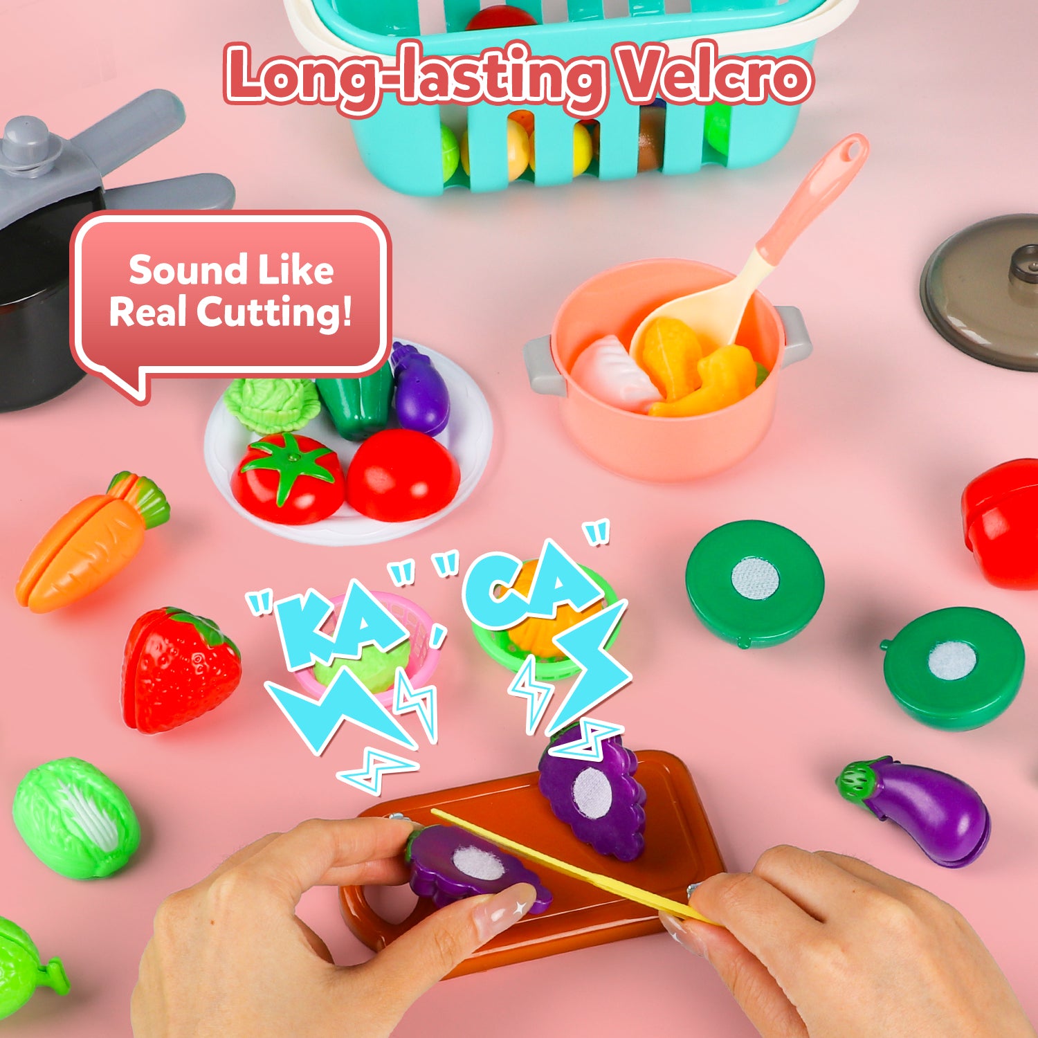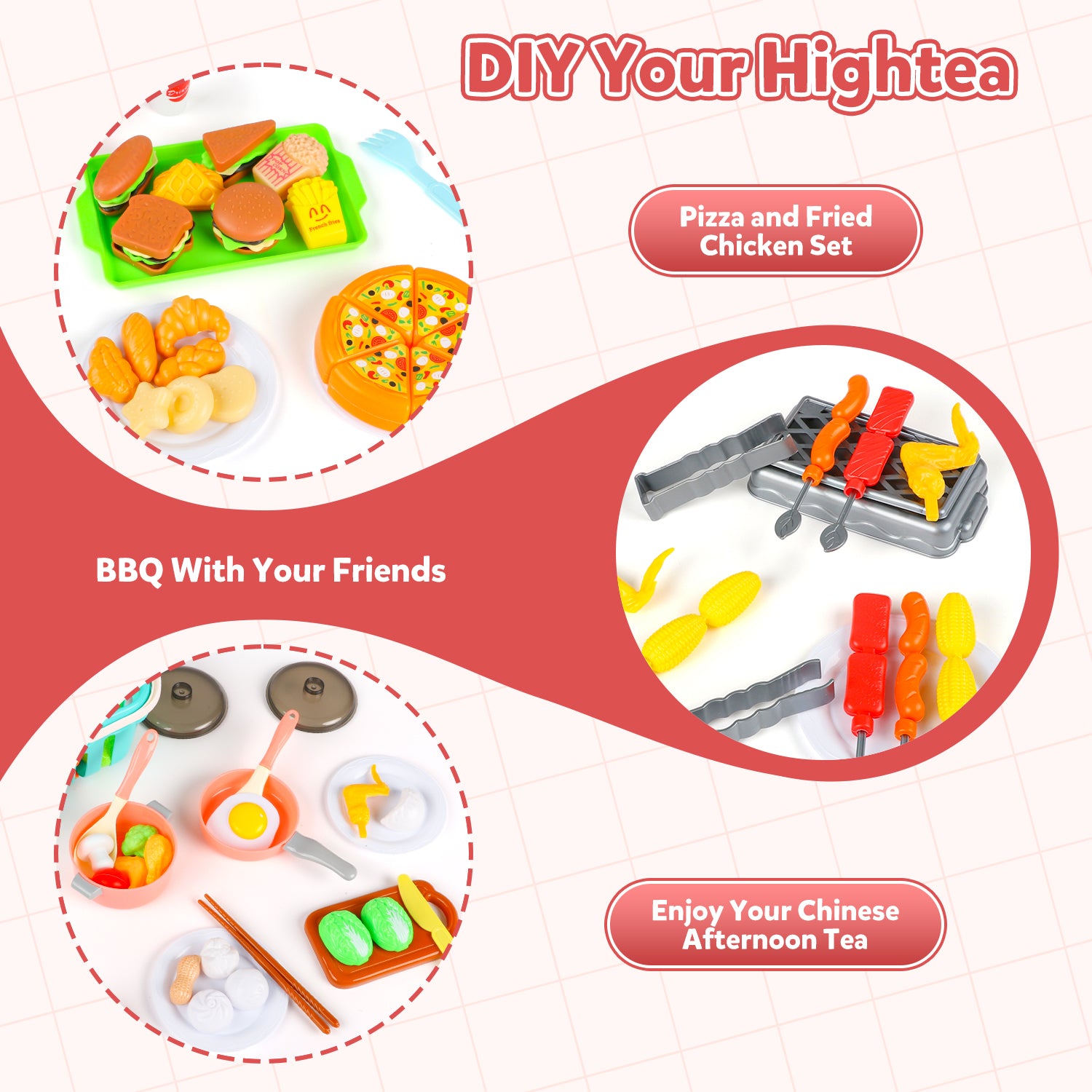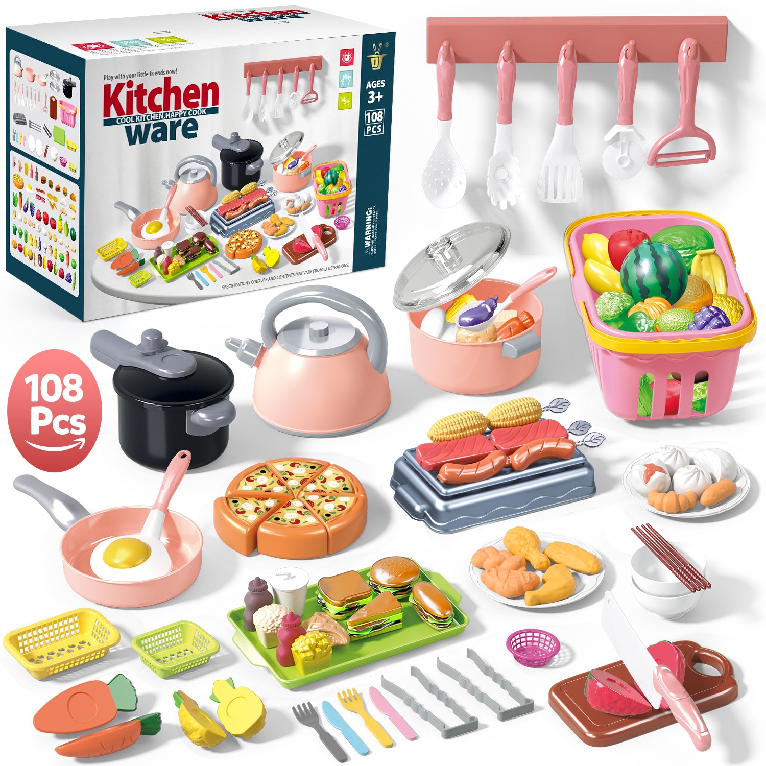 Each kitchen set comes with 108pcs fun, and engaging pretend kitchen toys, include play pots and pans sets, kettle, bowls, plates, chopsticks, toy kitchen cookware, barbecue play set, knives set, canned pretend cuttable food & vegetables, fast food set, and much more to provide endless hours of fun.