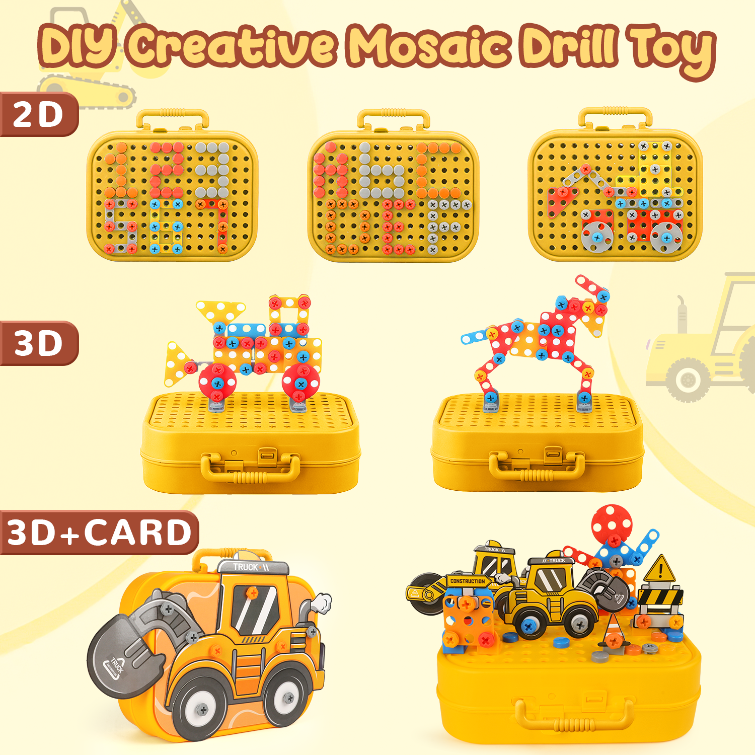 There are infinite combinations of 1D 2D and 3D buildings! Improve your kids' imagination and creativity by challenging them to build their own cars, animals, robots and anything they can imagine.By drilling and building different 2D/3D shapes according to the included instructions or their own imagination, children are encouraged to use and recognize tools.