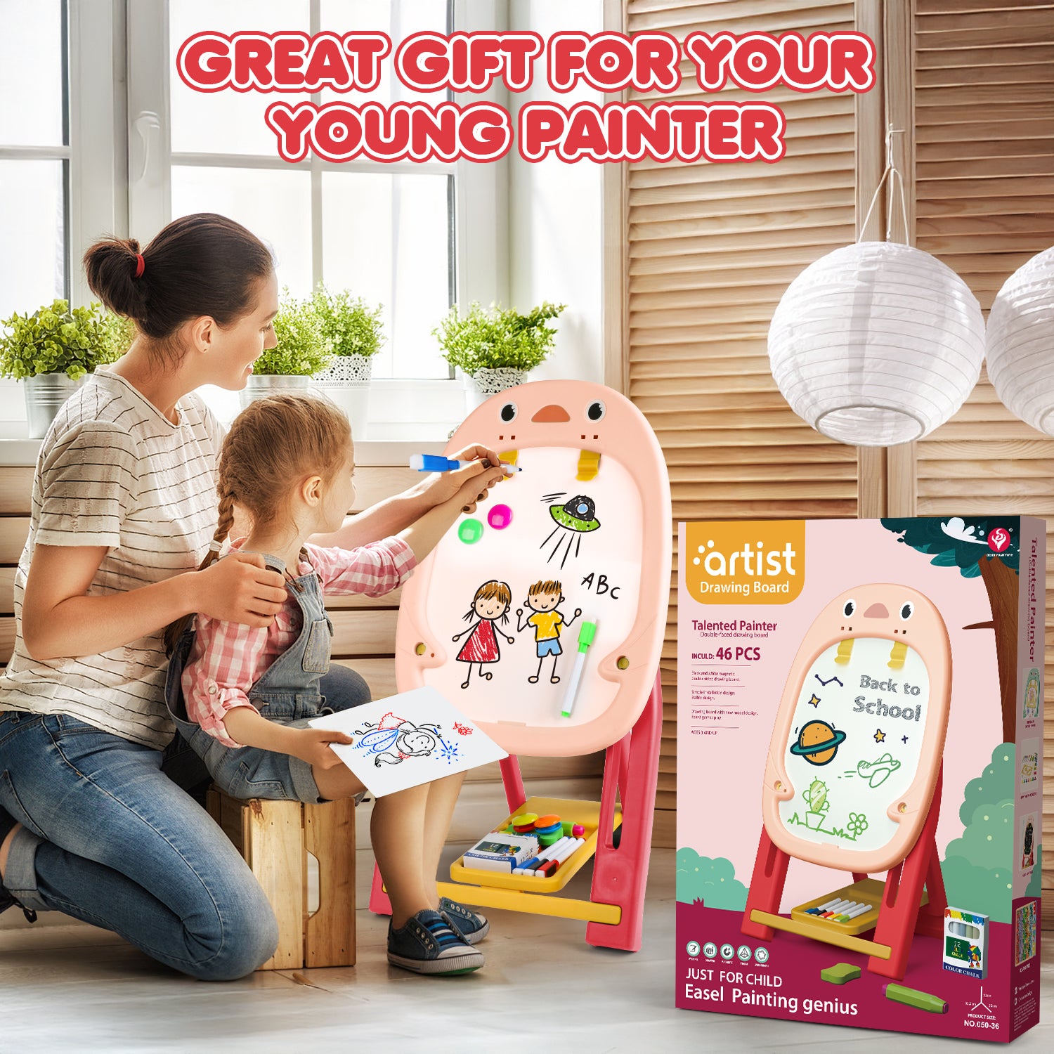 Huge Wave Easel for Kids, Double Sided Chalkboard and Whiteboard, with Drawing & Board Games Cards Accessories, Christmas Birthday Gift for Kids Age 2-6 (Pink)