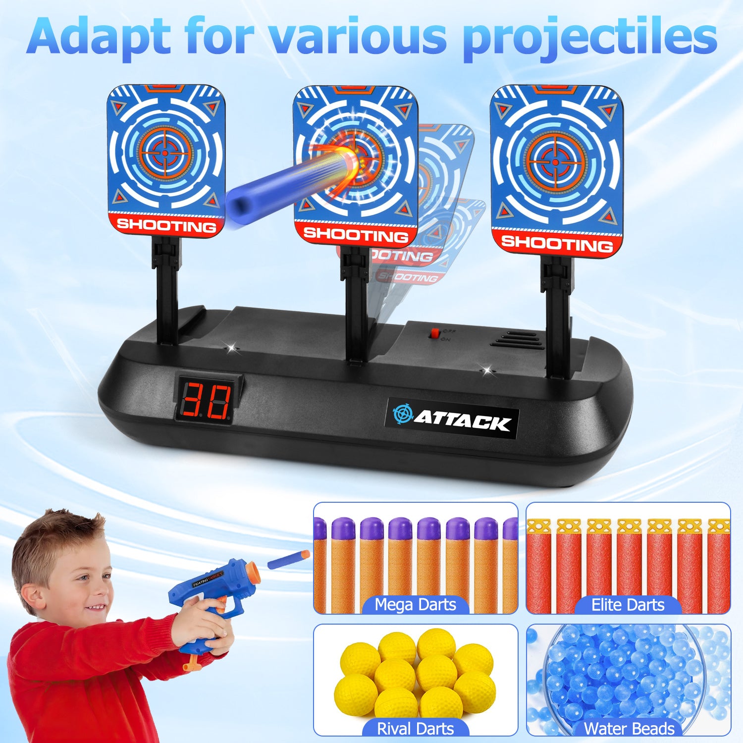 🎯【Digital Target Auto Rebound】:Electric digital shooting targets is very easy for kids to operate, Digital scoreboard tracks and displays scores when you hit targets and they fall down, then the strong electrical chance drives targets automatic rebound into position after seconds.