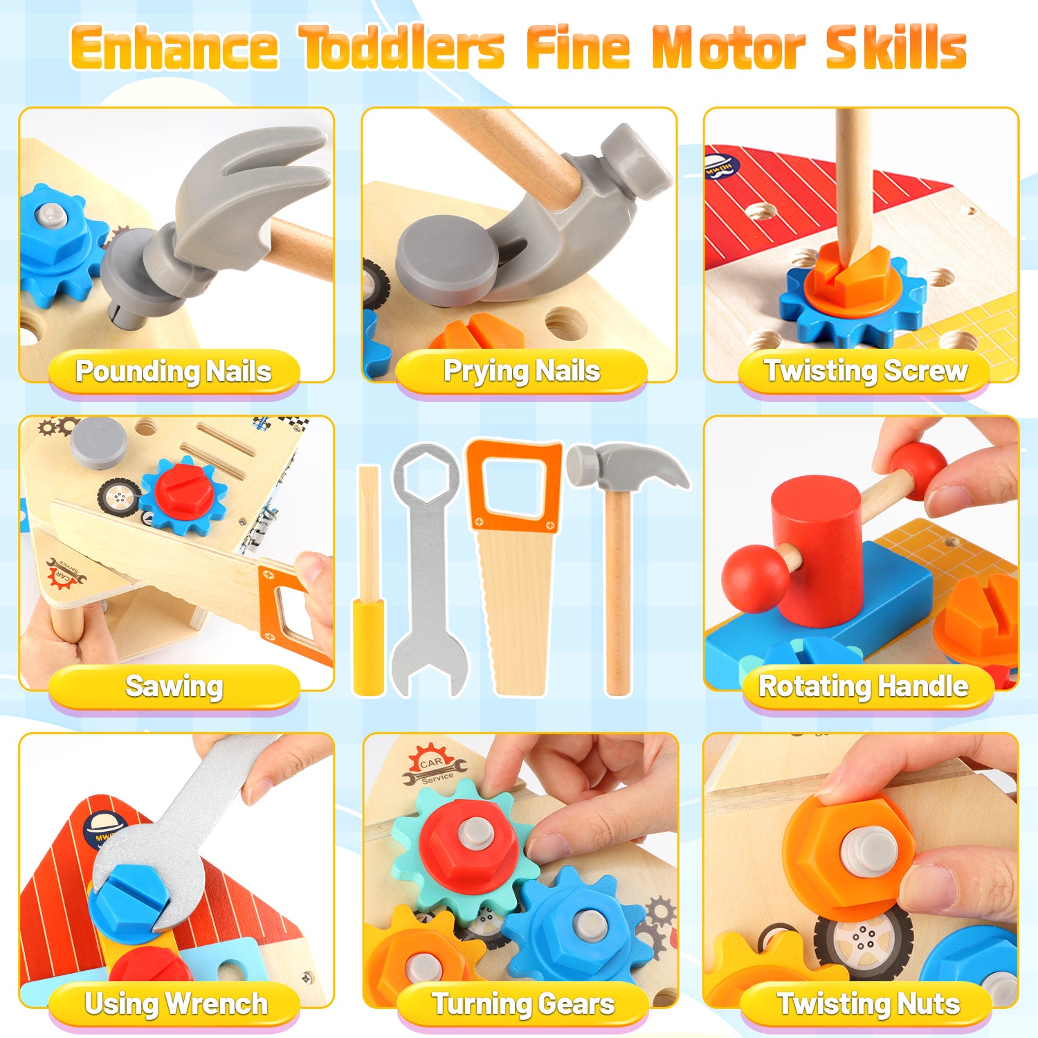 This 33-pieces wooden toddler tool set includes: slotted screwdriver, hex wrench, hammer, saw, 4 different combination plates, nut, 2 different combination blocks, 3 gears, hex screws, a variety of wood components.