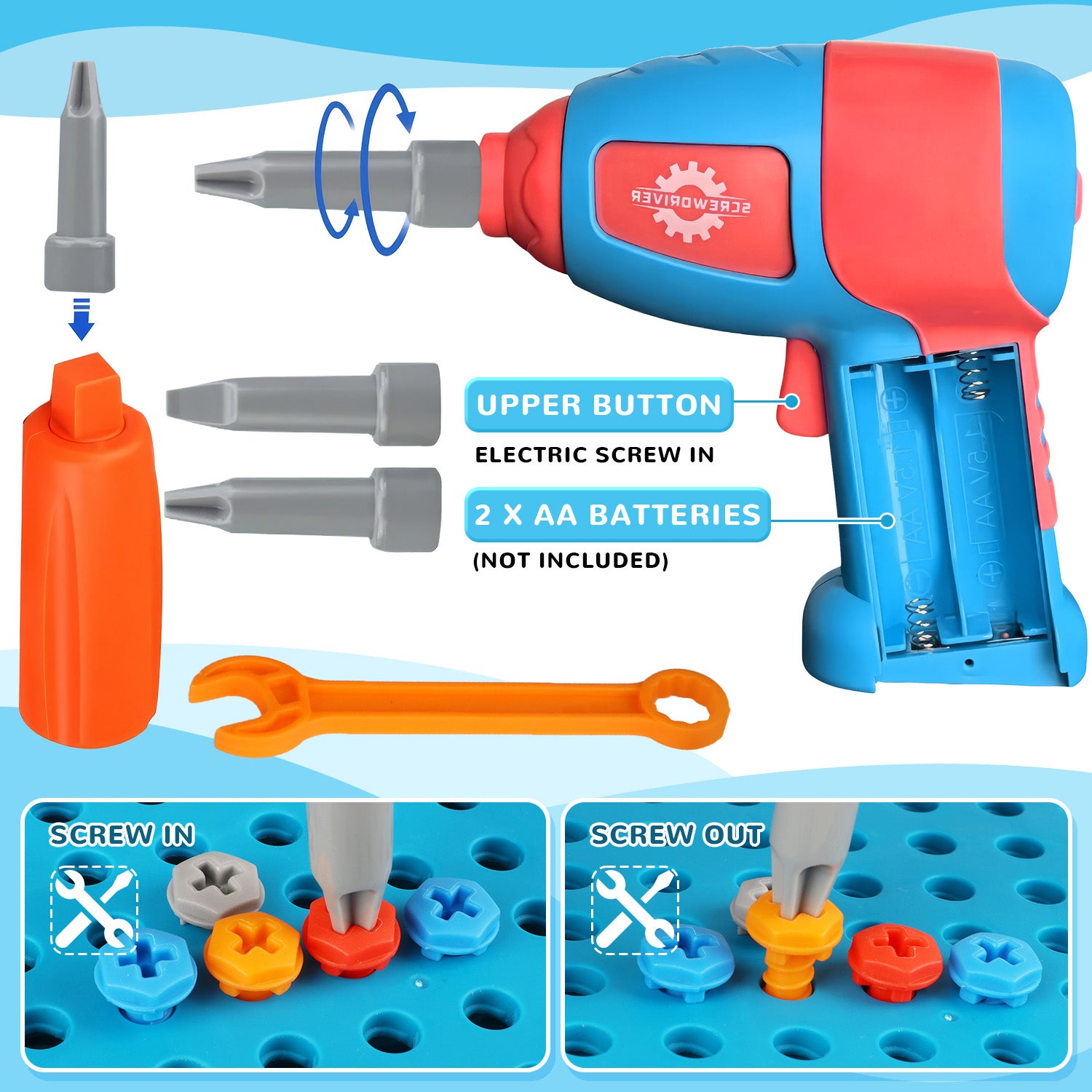 Crafted with top-notch ABS plastic, our drill set ensures durability and safety. The polished edges guarantee a smooth feel, while the toy drill, powered by AA batteries (not included), operates at a slow speed, eliminating any risk of harm to your child.