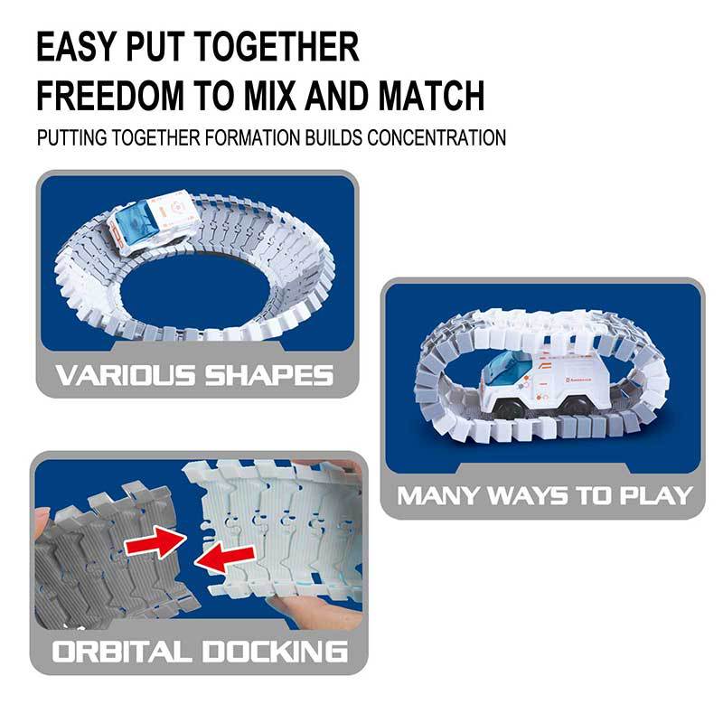 242 Space track pieces include - 1 battery electric space racecar, rocket model, satellite model, bridge bracket, forked orbit, flexible track, 2 space doll and signal receiver model, rich accessories create a space world race road.