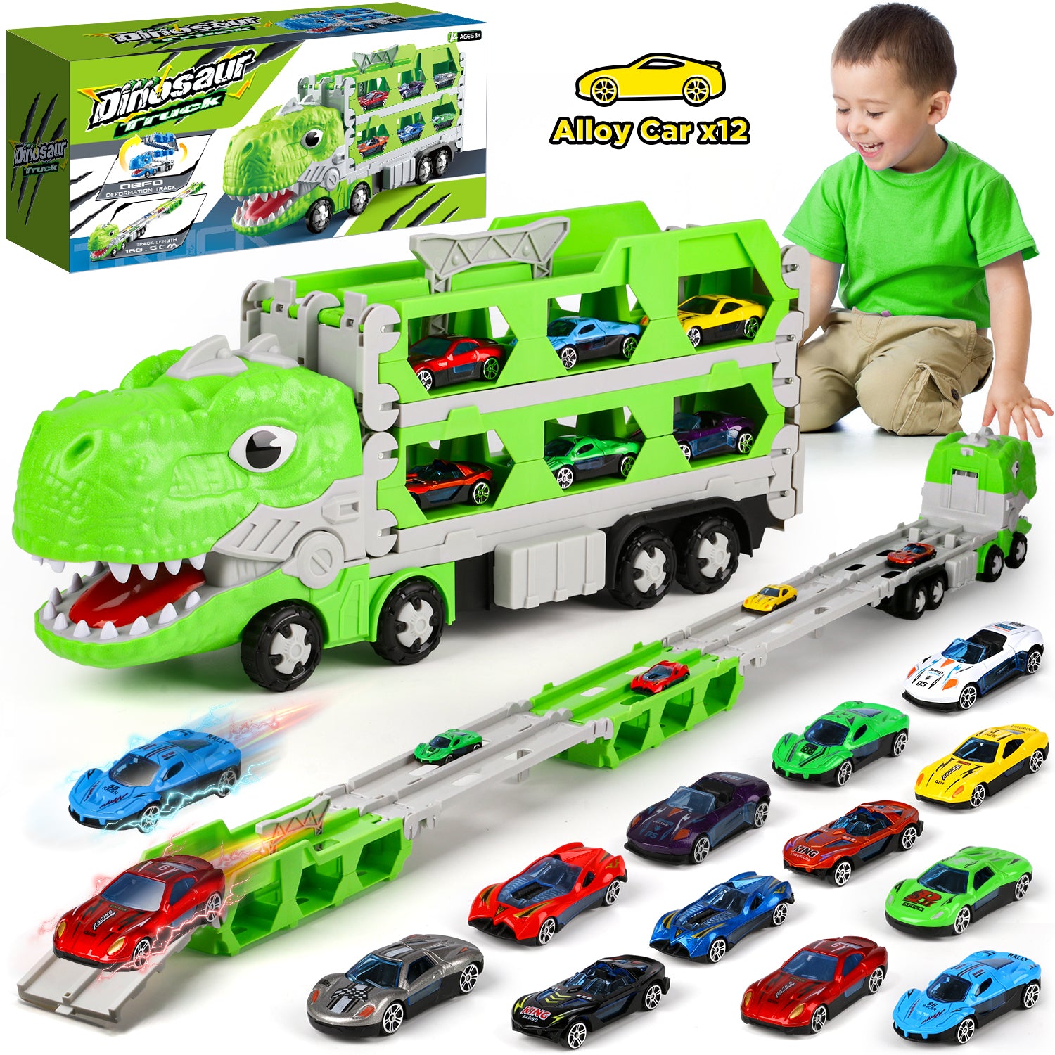 - 【3-In-1 Transport Dinosaur Truck Toys】:This trucks toys for 3 4 5 6 year old boys makes for great push-around play on its own, while also serving as storage space for small cars. And the 3-in-1 truck toy for boys also transforms into a 66.3-inch race track with a dual launcher for competitive racing.