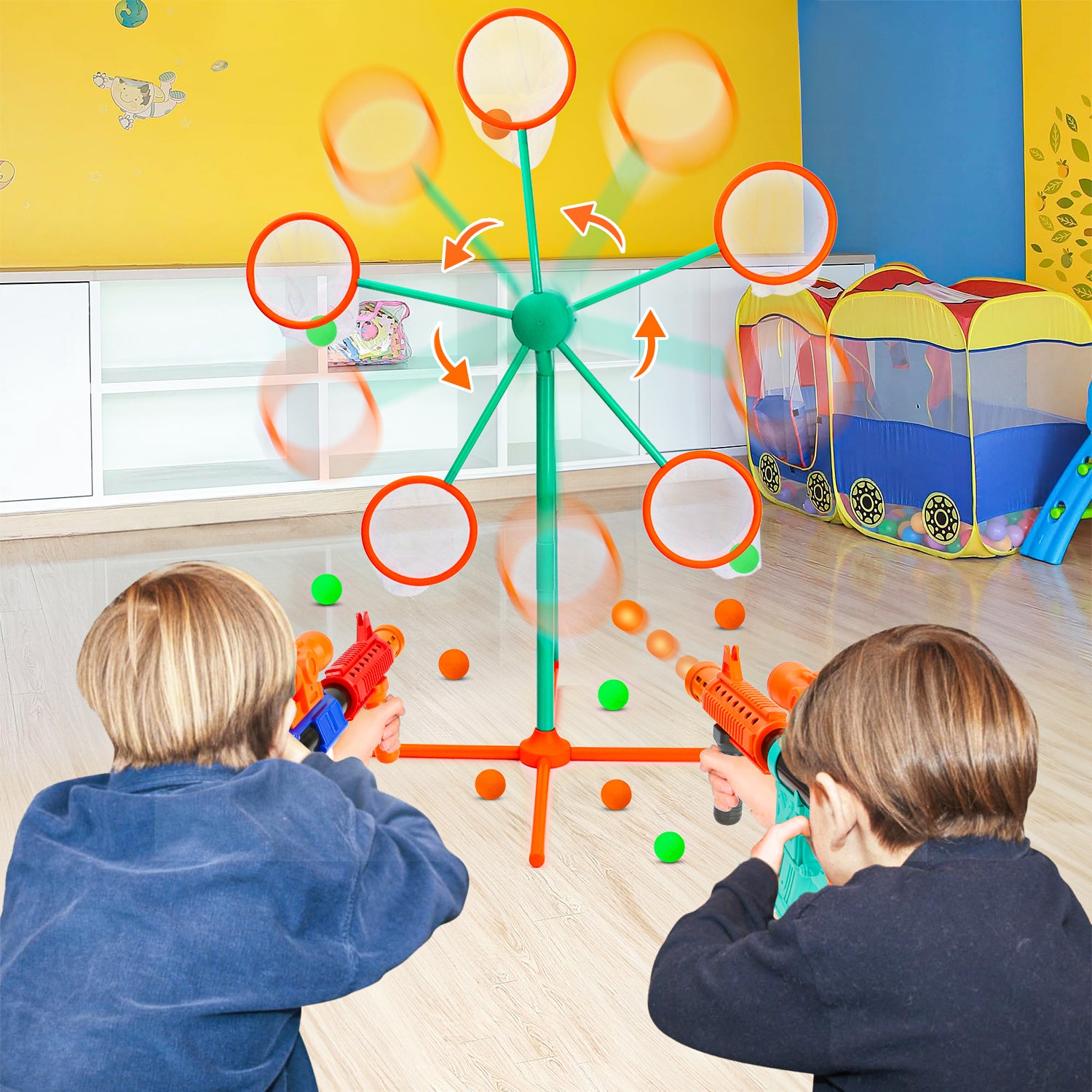 - INTERESTING SHOOTING GAME: This Huge Wave new set of shooting toy set includes 2 pneumatic blaster, 24 soft foam balls (orange and green), 1 large unique electric rotating moving target, bringing you a more fun shooting experience. Suitable for children to play indoors or outdoors.