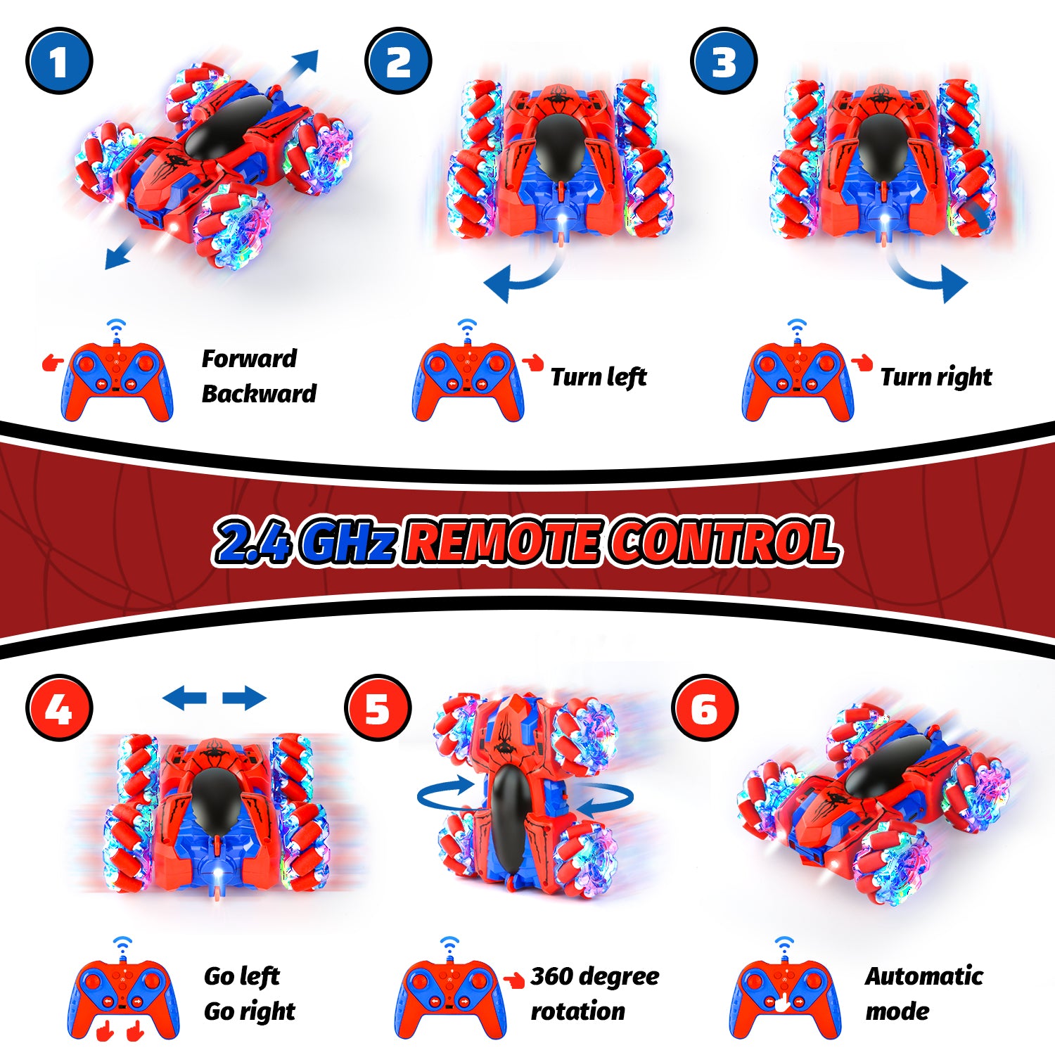 - 🕷【All-round Drift】:Our RC Cars support double sides running, moving forward, backward, turning left, right, 360 degree tumbling flip to bring you fantastic driving experience. You can control this electric remote control stunt car in any direction with its remote controller to create endless fun to kids.