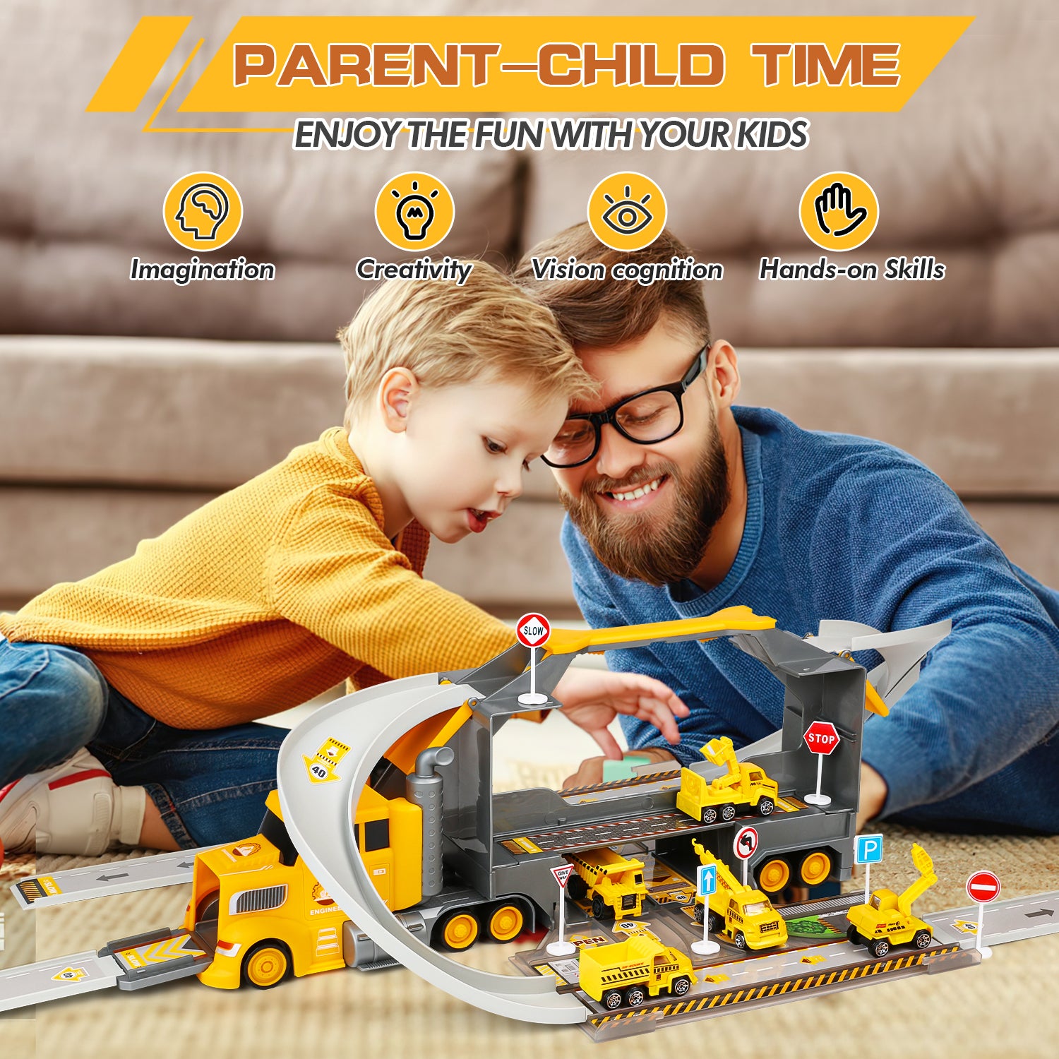 🚪DUAL-SIDED OPENING DOORS & VERSATILE STORAGE - This construction truck boast double-sided opening doors, transforming it into mini storage compartments for not just additional cars but also your child's trinkets and treasures. This versatile design promotes creativity and imagination, as kids can set up their own mini worlds, storing and transporting their favorite items in style.