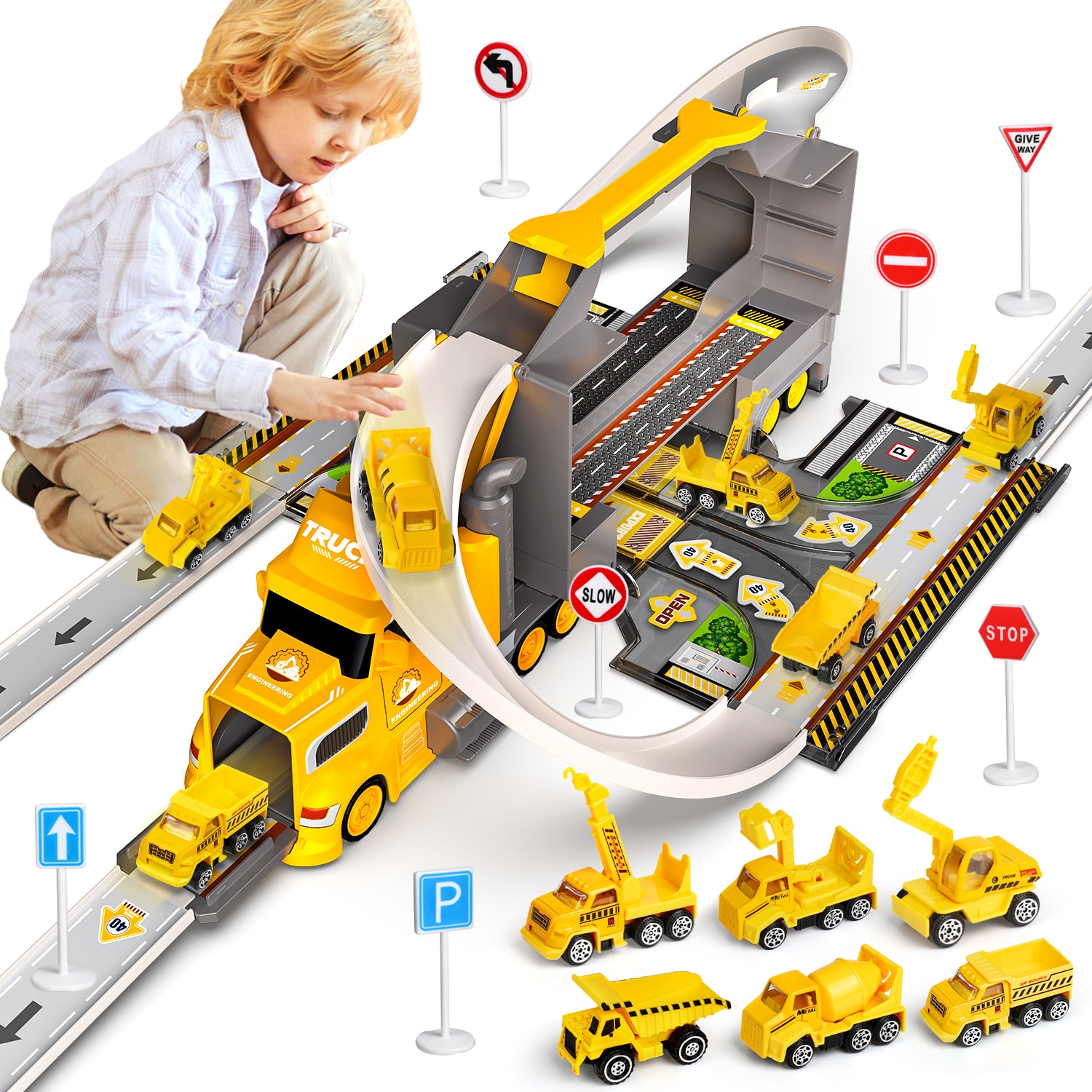 Construction Trucks for Toddlers Race Track Play set, 7in1 Construction Toys in Transport Car Carrier,Kids Construction Toys Birthday Gifts for Boys Girls 5-7(Yellow)